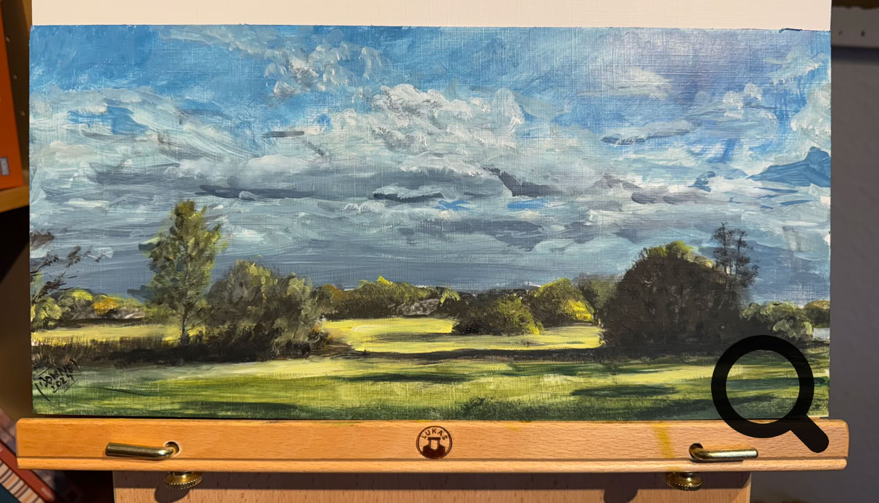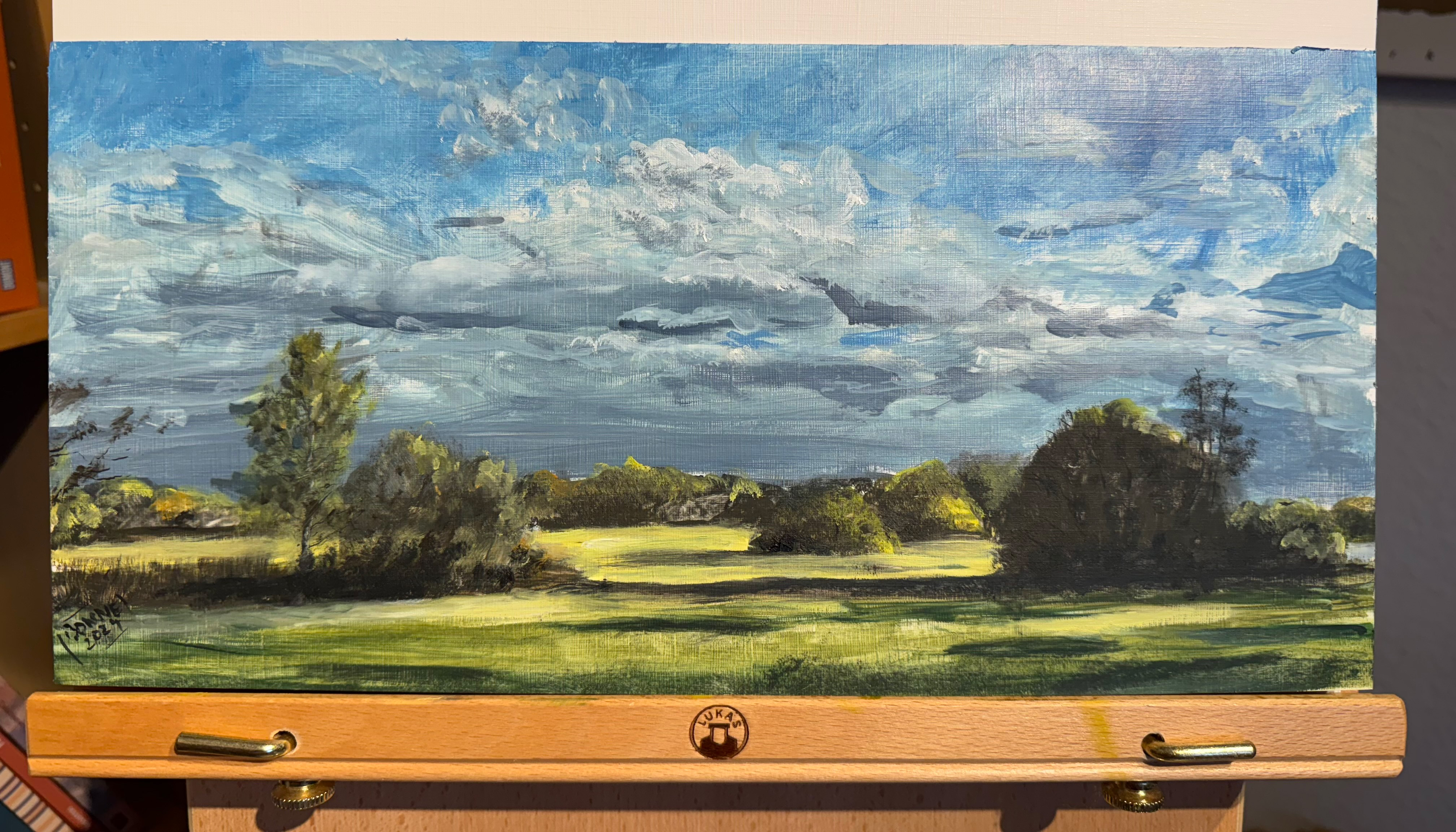 Dieses Gemälde zeigt eine weitläufige Landschaft mit intensivem Himmel. Die Wolkenformationen sind dramatisch und verleihen der Szene eine lebendige Dynamik. Die Wiese im Vordergrund ist von Bäumen gesäumt, die im Sonnenlicht leuchten und tiefe Schatten werfen. Die Farbtöne sind erdig und natürlich, wodurch eine ruhige und friedliche Atmosphäre entsteht. Dieses Werk fängt die Essenz eines sonnigen Tages ein und lädt den Betrachter ein, in die Tiefe der Landschaft einzutauchen.