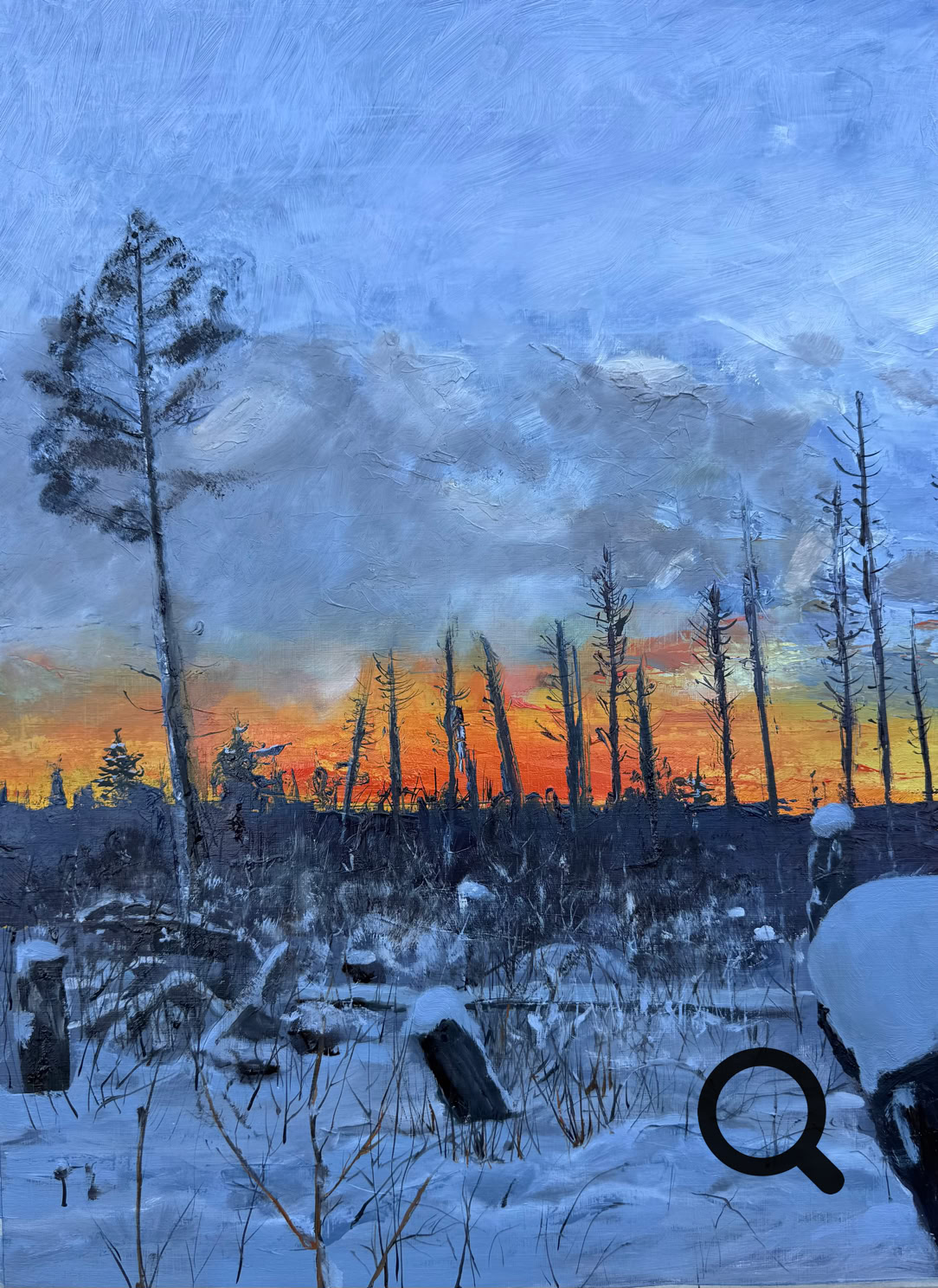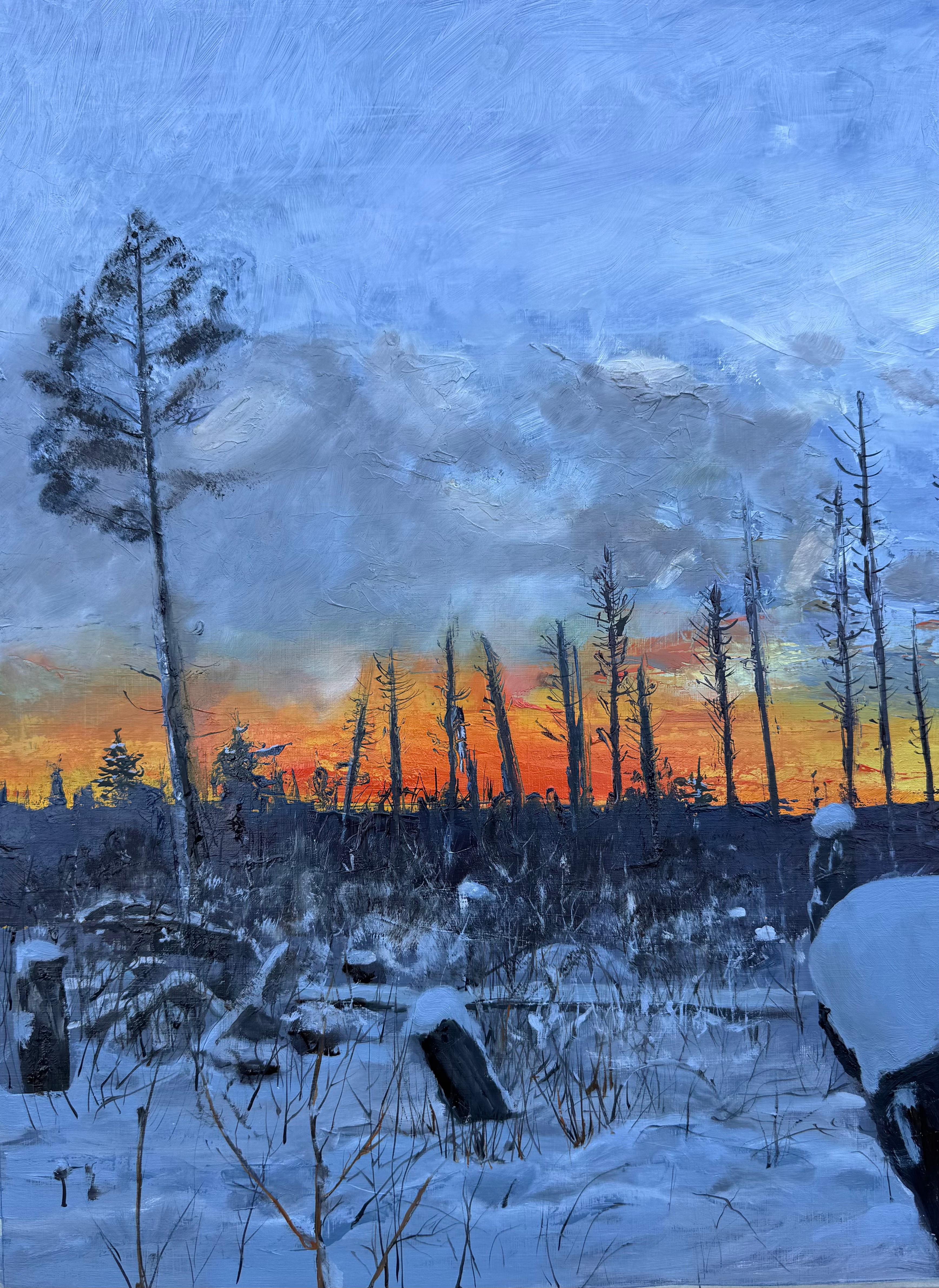 In diesem Gemälde verschmilzt die stille Schönheit eines verschneiten Waldes it der dramatischen Farbpalette eines winterlichen Sonnenuntergangs. Die tief verschneite Landschaft wird von einem sanften, aber eindrucksvollen Farbspiel durchzogen, das den Himmel in warmen Orange- und Rottönen erstrahlen lässt und so einen reizvollen Kontrast zur kühlen, blauen Dämmerung bildet.