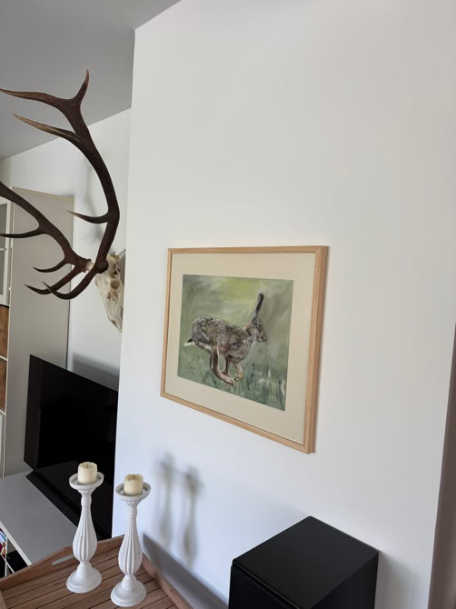 Das Bild in seinen natürlichen Farben zeigt die Stimmung, wie wir ihn in seiner Umgebung wahrnehmen: Immer wachsam und oft auf der Flucht. Seine langen Hinterläufe bringen ihn auf bis zu 60 km/h.